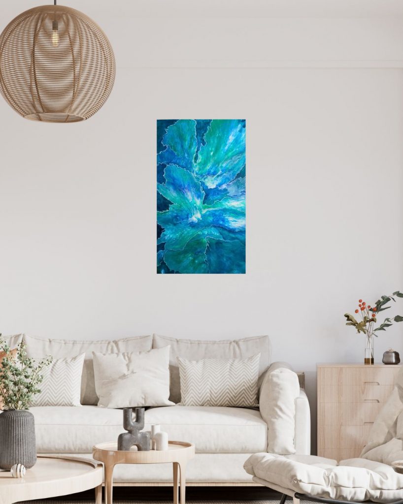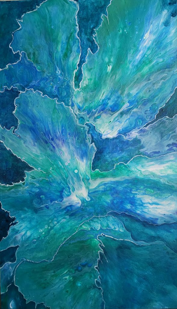 In quest’opera ho lasciato che i colori scorressero liberi, fondendosi in una danza morbida di blu e turchese. Dalla colata fluida sono nati petali che sembrano sbocciare con grazia, delicati come fiori sospesi nell’aria.