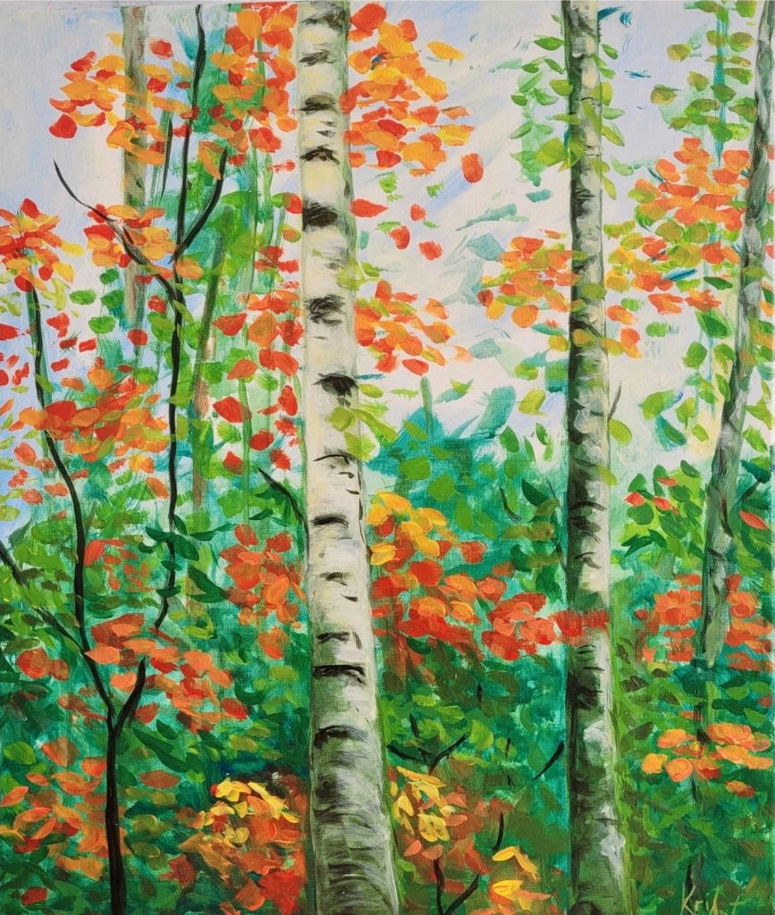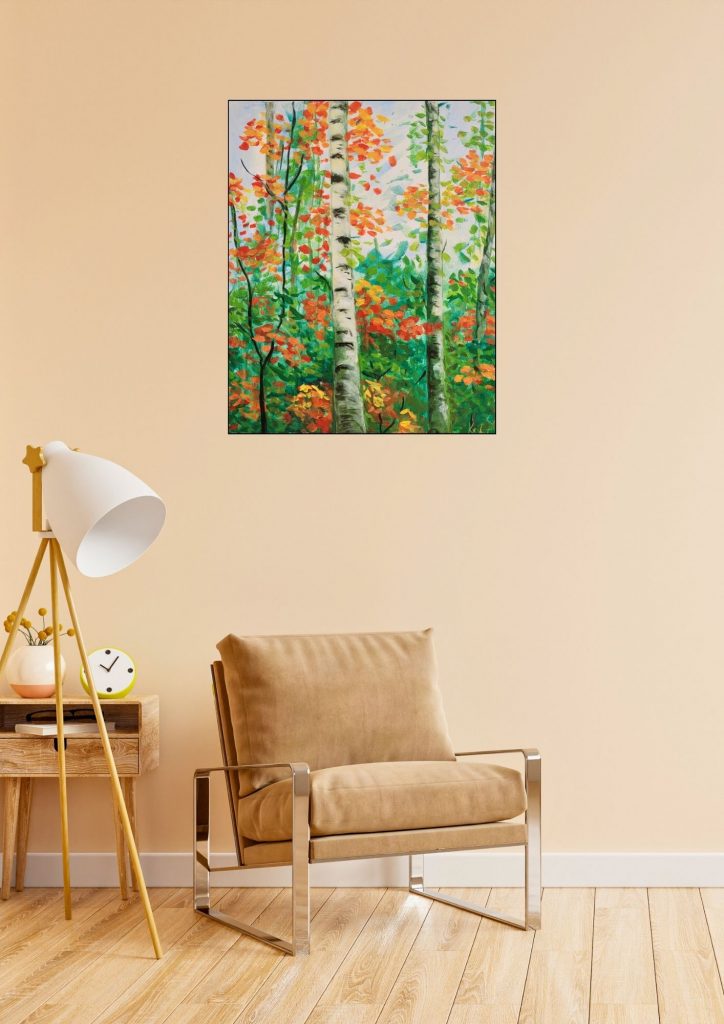 Amo i paesaggi autunnali, dove ogni foglia si colora di sfumature intense, dal giallo dorato al verde che sfuma nei toni del rosso. È proprio guardando questi colori che è nata quest’opera.