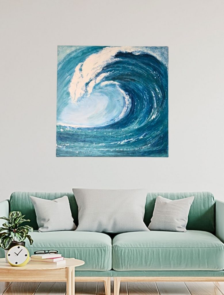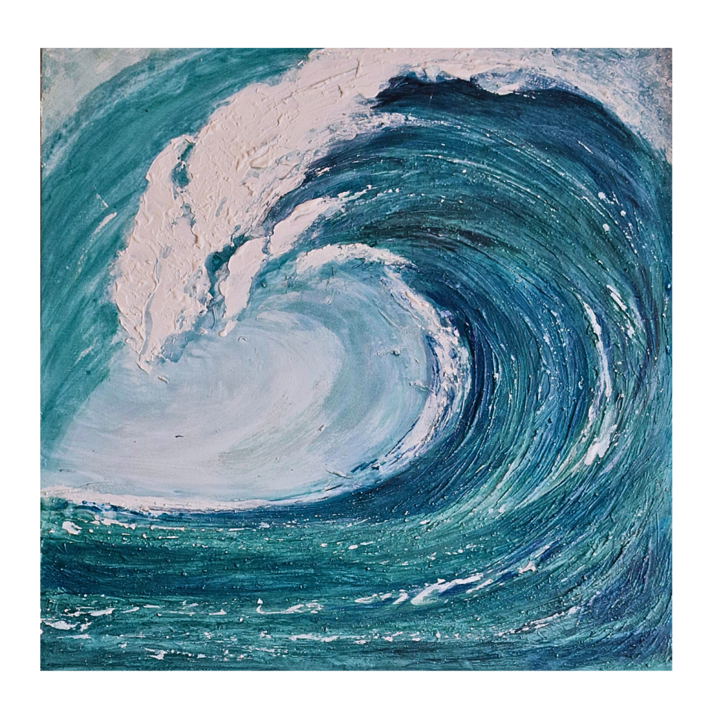 Qui, una grande onda rappresenta l’apice dell’emozione: il momento in cui ci si lascia travolgere completamente. La texture materica dona profondità e tridimensionalità, mentre le sfumature fluide creano un continuo senso di movimento.