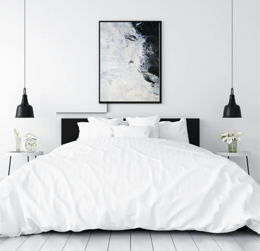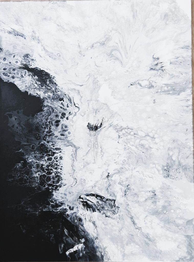 Metamorfosi” è un’opera che racconta il profondo viaggio interiore che accompagna ogni cambiamento. Attraverso la tecnica della Fluid Art, il nero, il grigio e l’argento si fondono in un flusso dinamico e imprevedibile, evocando le fasi della trasformazione personale.