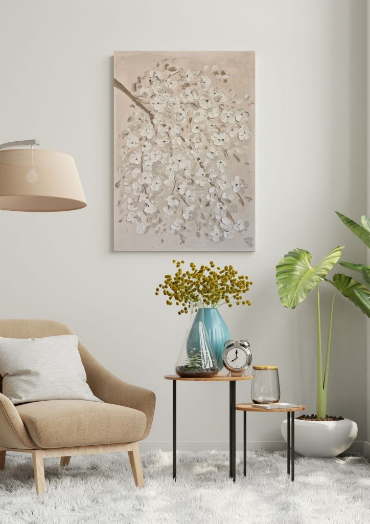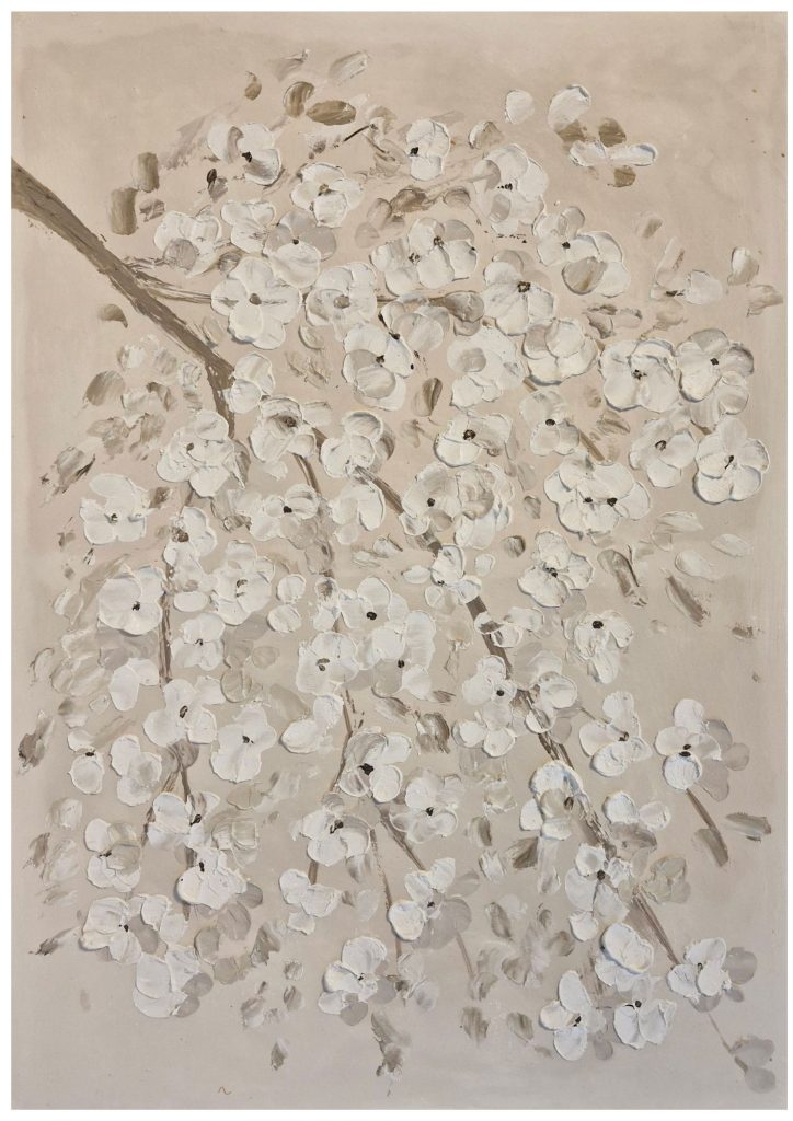 “Primavera” è un’opera dai toni neutri, che passano dal beige al marrone delicato, e ha come soggetto un ramo di ciliegio in fiore. La primavera è una stagione meravigliosa, in cui tutta la natura si apre al nuovo e si rinnova, forte delle esperienze delle stagioni passate.